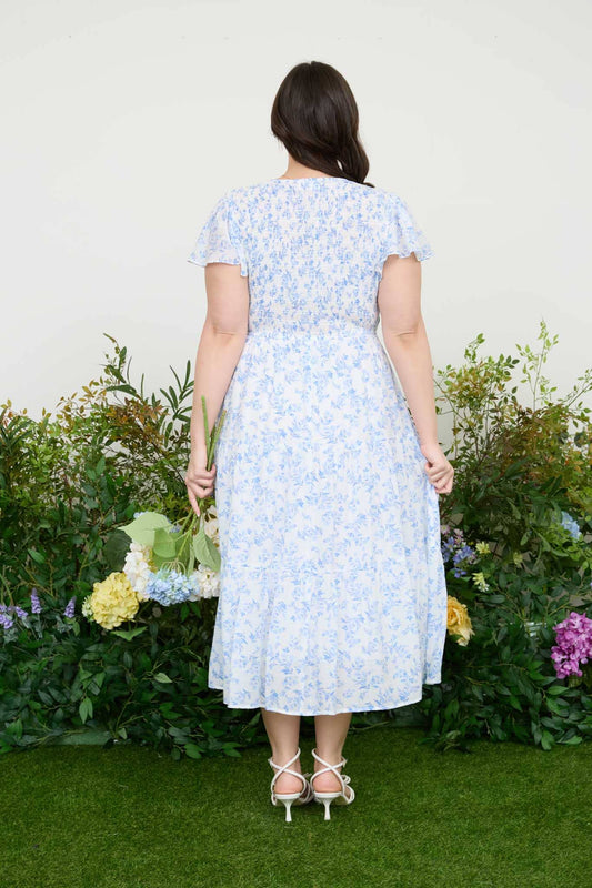 PL FLORAL V NECK SMOCKED SHORT SLEEVE MIDI DRESS