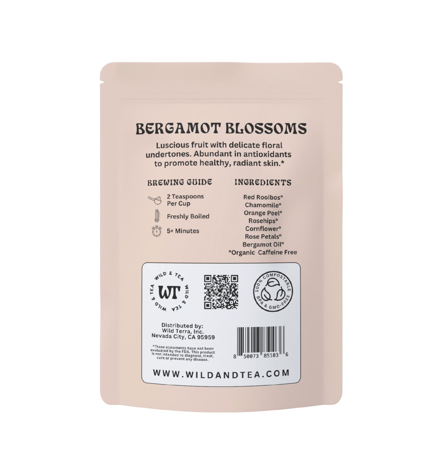 Organic Ingredients- Red rooibos, chamomile, orange peel, rosehips, cornflower, rose and bergamot oil.