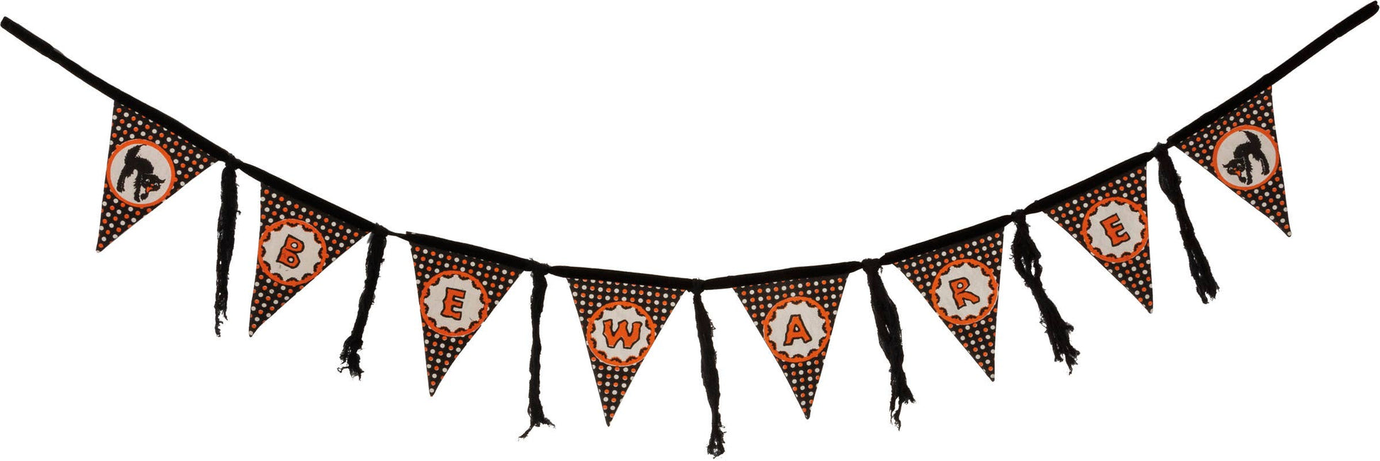 A vintage-inspired fabric pennant garland from our Halloween Collection featuring a "Beware" sentiment with patterned background, cat designs, and strips of distressed fabric streamers.