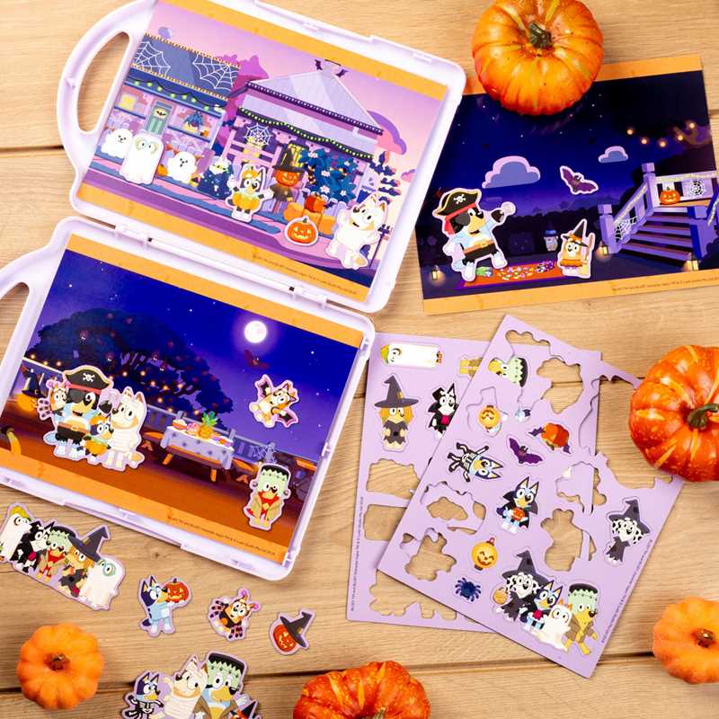 Bluey and her sister Bingo are so excited for Halloween! The spooky fun is never done in this play case with an activity pad full of mazes, coloring, and more. Pick Bluey and Bingo’s costumes, fill their house with spooky decorations, pick your favorite Halloween candy, and so much more. Young Bluey fans can use the 30 magnets to decorate the 6 play scenes for extended fun in this interactive format!