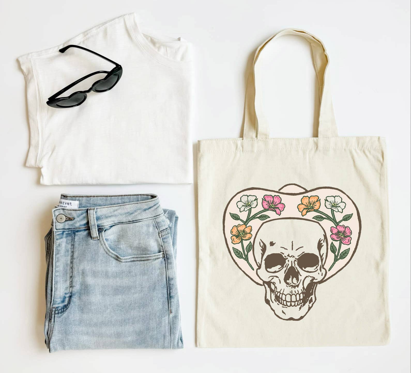 Western grit meets floral charm in this bestselling skull tote bag. Featuring a detailed vintage-style skull wearing a cowboy hat adorned with soft pastel flowers, this cotton canvas bag is equal parts spooky and sweet.