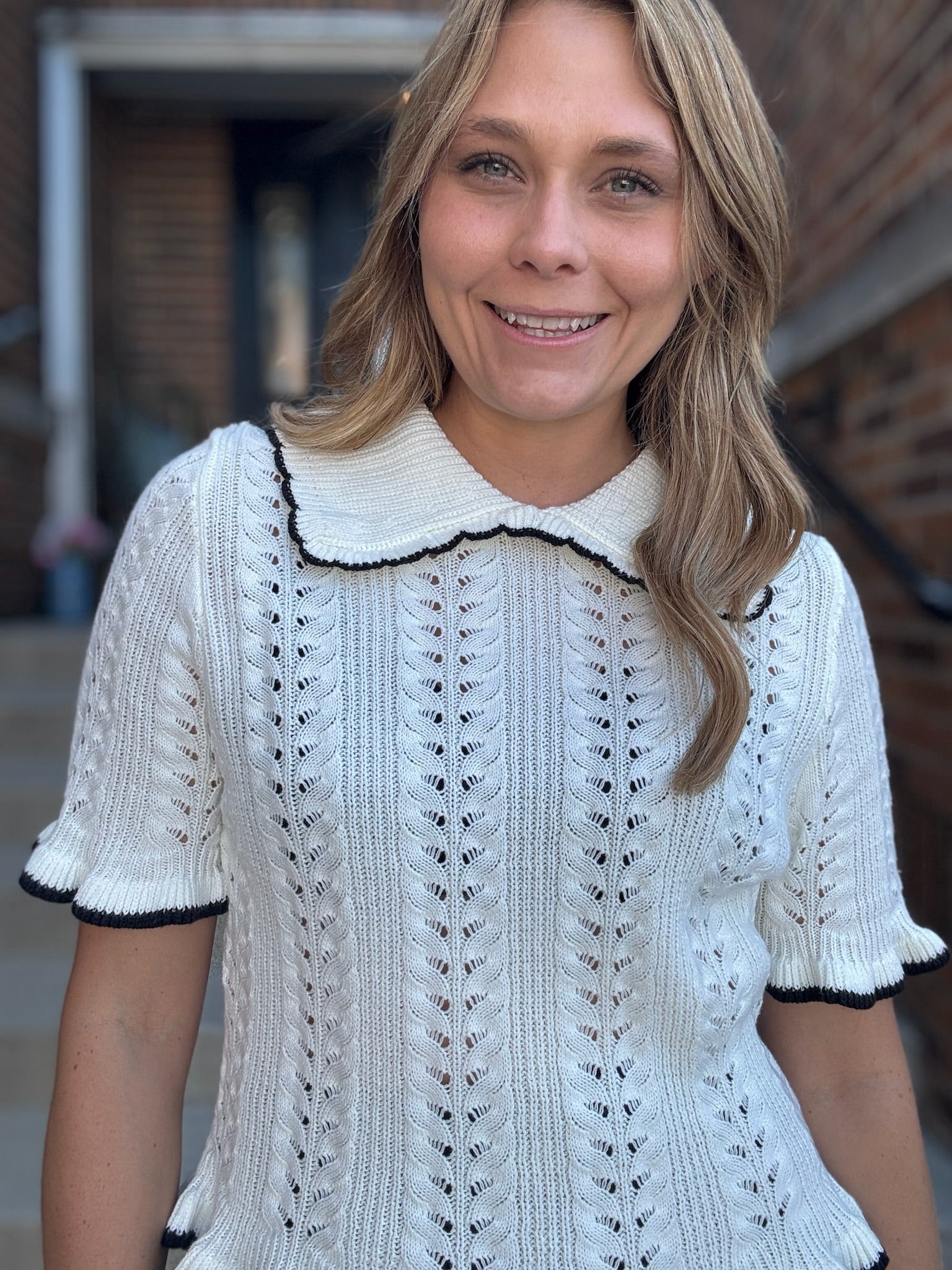 CROCHET KNIT SHORT-SLEEVE TOP WITH COLLAR AND RUFFLED RIB KNIT CUFF AND HEM