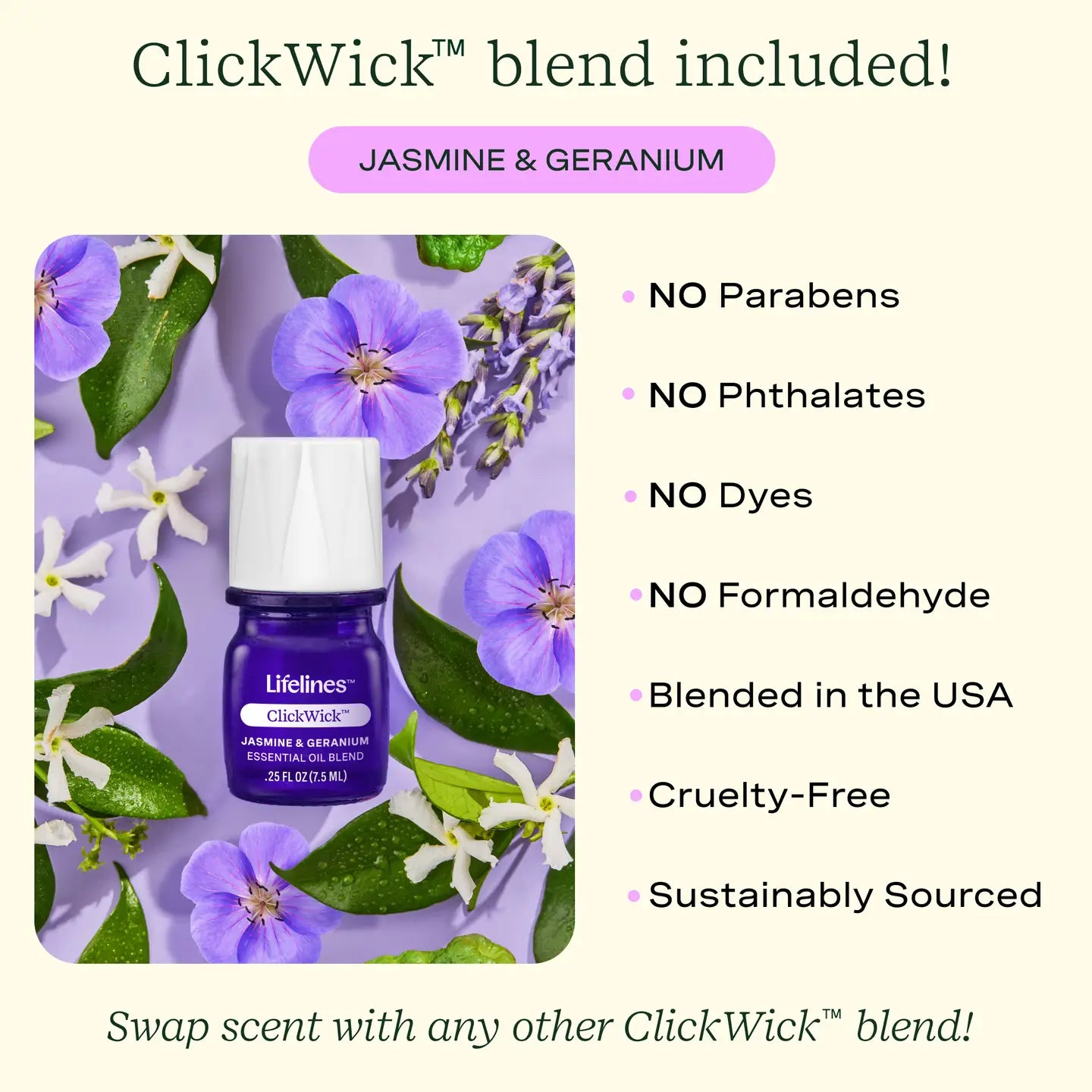 Bubble Cream Candle comes with a ClickWick Rosemary & Lemon essential oil blend bottle.