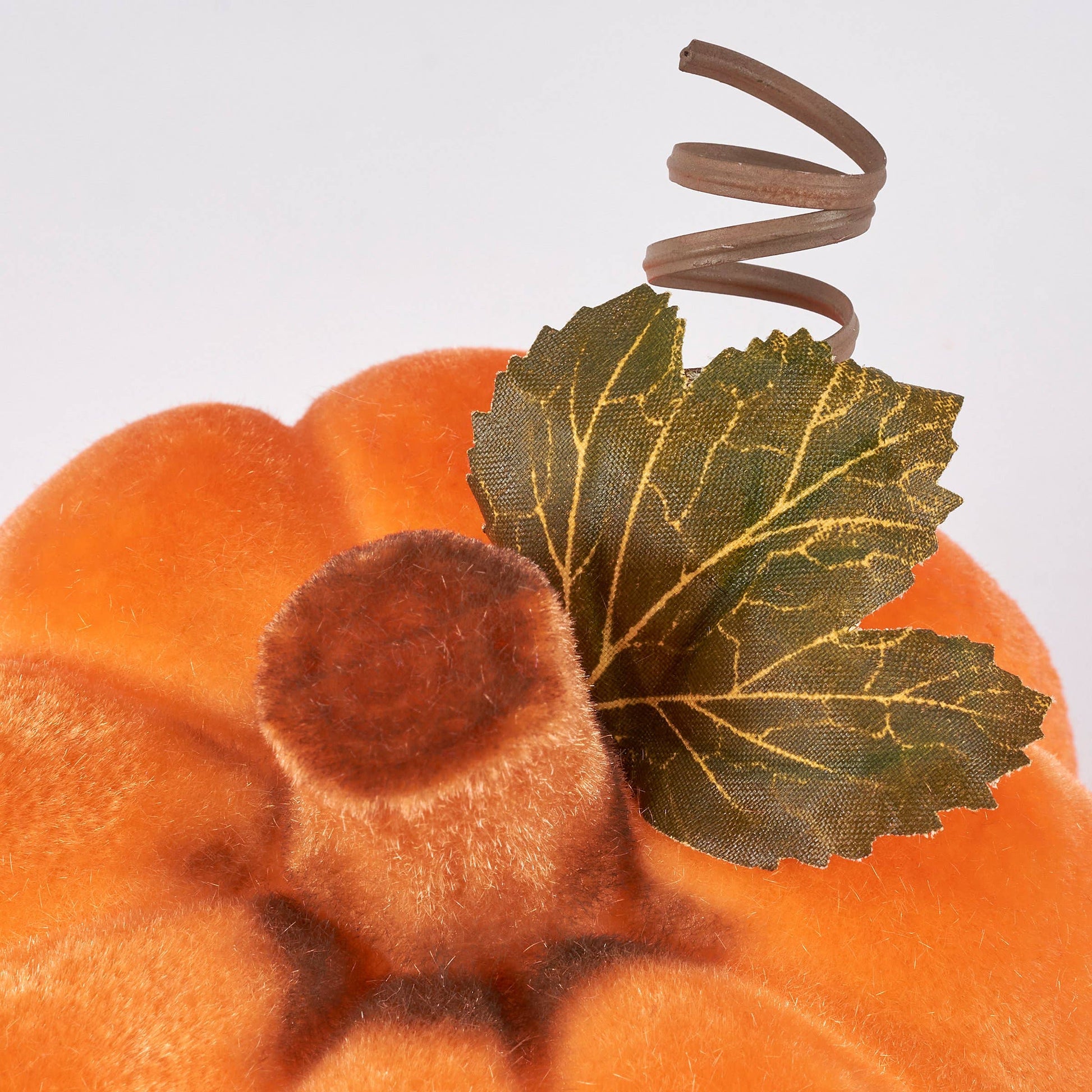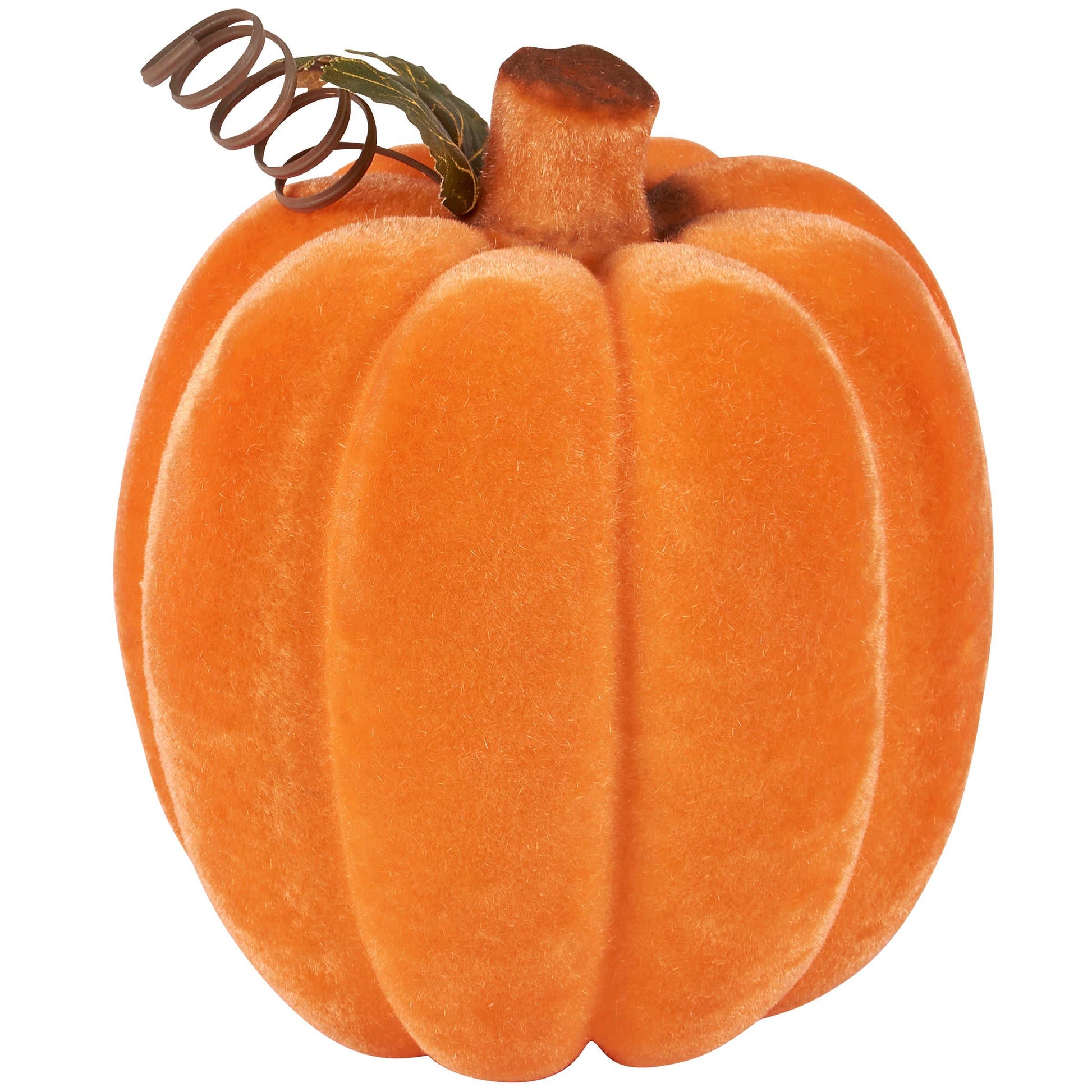 A decorative pumpkin from our Halloween Collection featuring a neon orange flocked finish and stem with faux greenery accent for added interest. Our Flocked Neon Orange pumpkin is designed to free-stand on any flat surface. Place in a display to add a fun touch of Halloween that looks great in blacklight or with other decorative pumpkins as a collection. A fun neon home accent with a variety of seasonal display options.