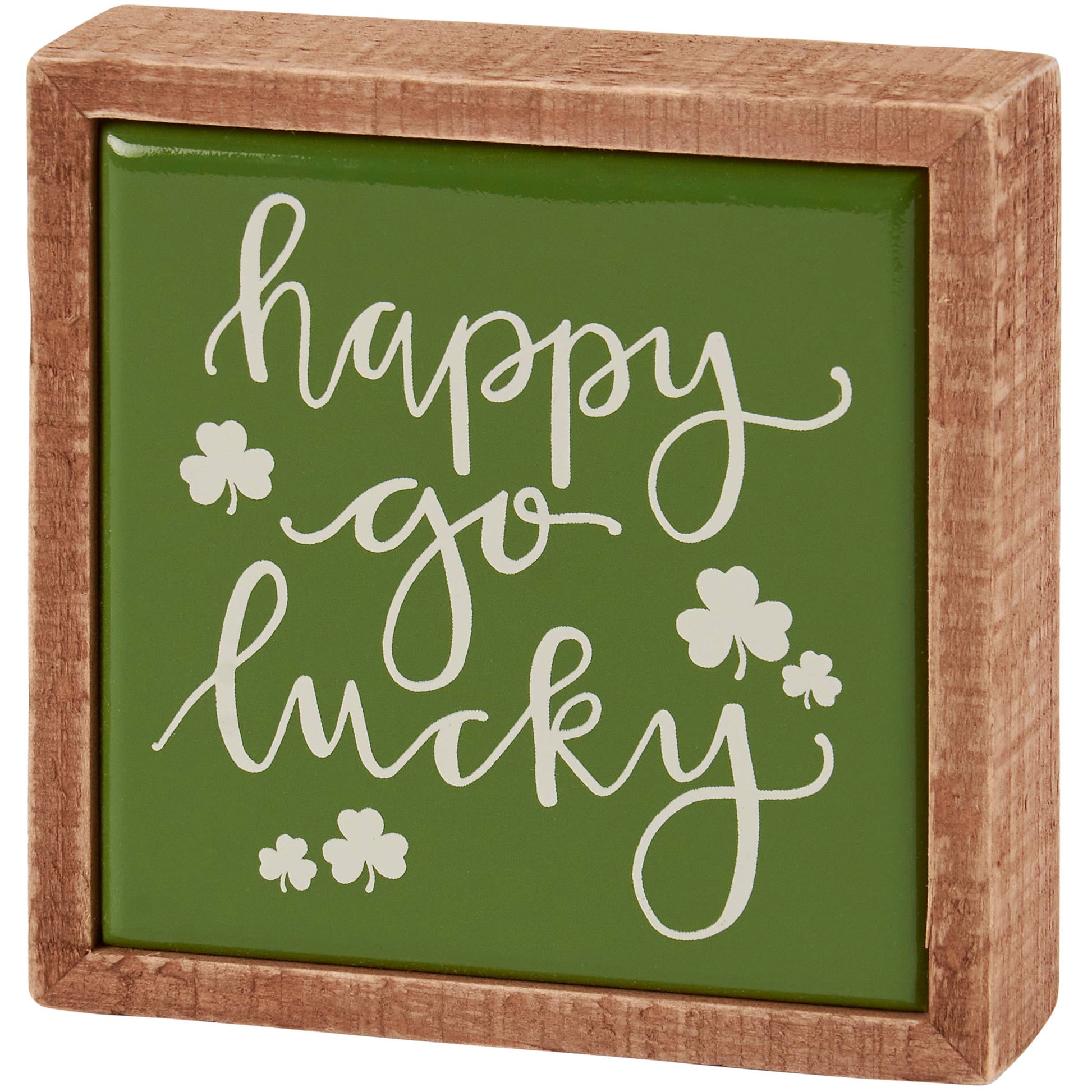 A small wooden box sign from our St. Patrick's Day Collection displaying shamrocks and a unique hand illustrated sentiment on holiday green background that reads "Happy Go Lucky." Seasonal mini box sign features a natural wood frame and faux enamel finish behind design for a tile-like appearance. Our Happy Go Lucky box sign mini is easy to hang or can free-stand alone. A fun St. Patrick's Day themed home accent that can easily blend into any display.