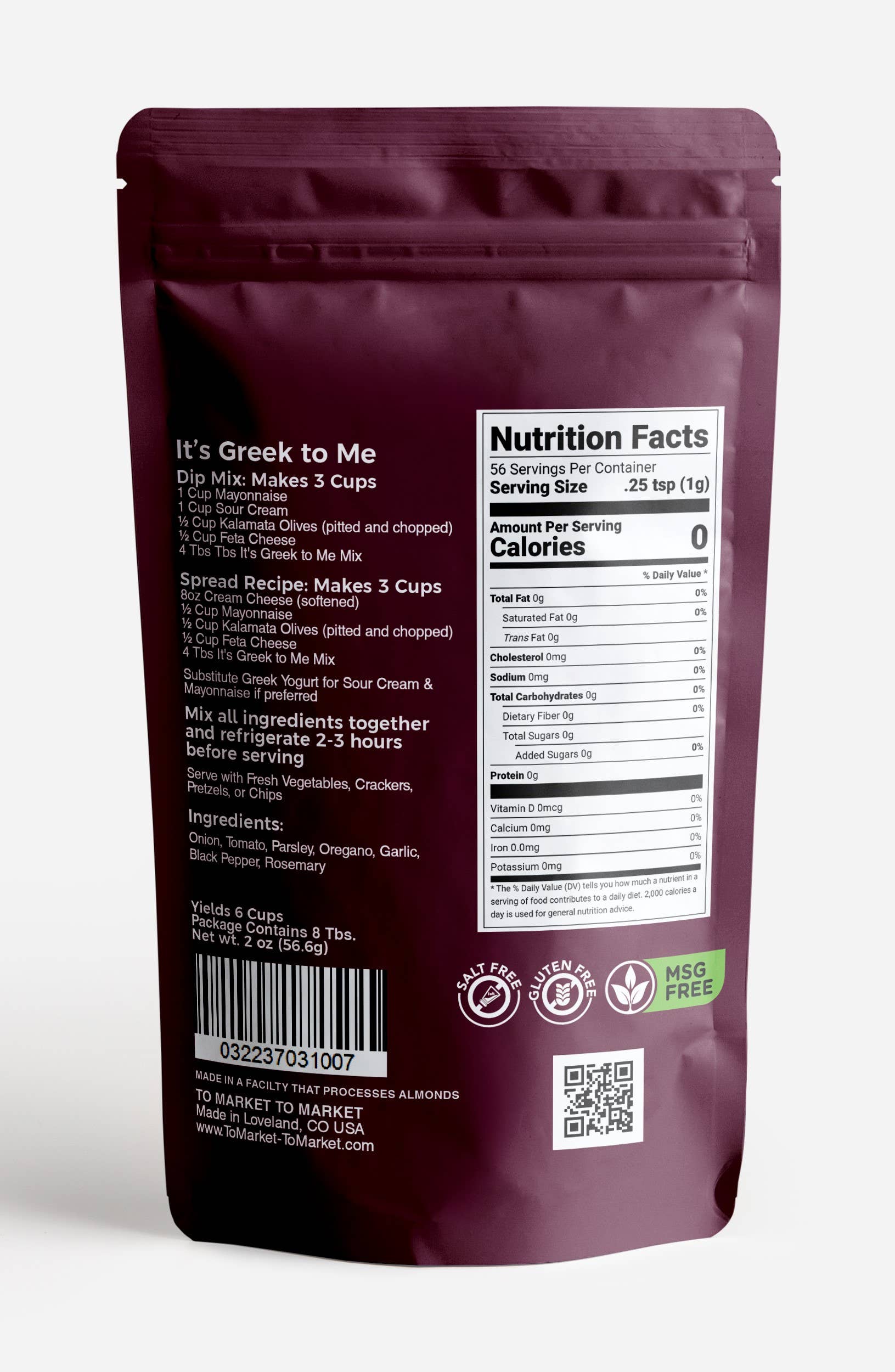 Each Case contains (12) 2oz Re-sealable pouches of "It's Greek to Me!" and 2 display trays that hold 6 bags each.