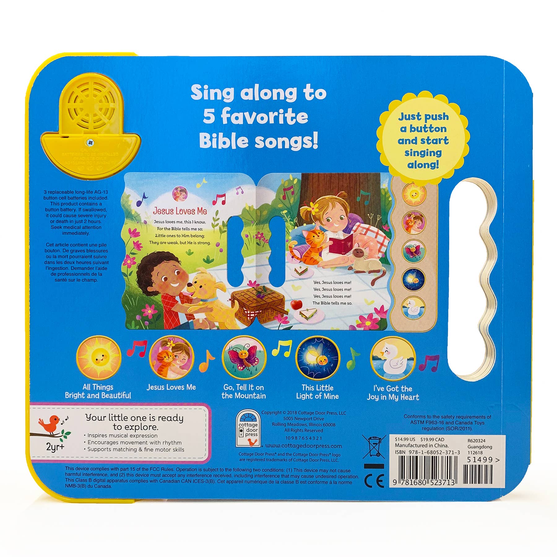 Enjoy a fun, family activity by reading and singing to 5 Bible songs! Read along to the lyrics of each familiar song and press the buttons on the wooden side panel to play sounds for your sing-along. Each button has a corresponding icon on the page to match the lyrics with the melody.
