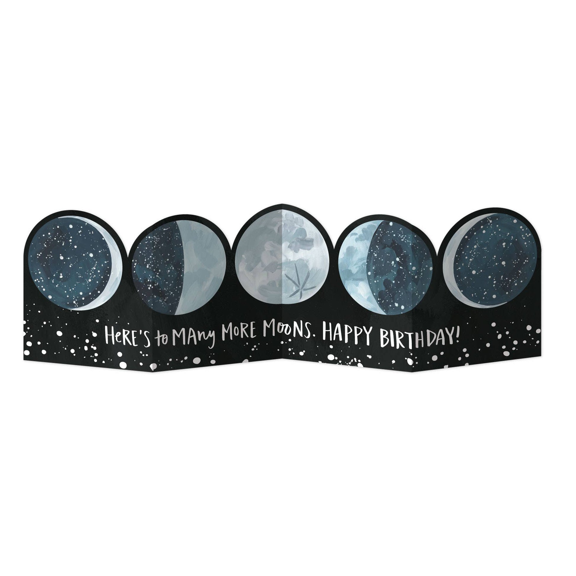 Celebrate another trip around the sun with the Many Moons Birthday Accordion Greeting Card. Featuring a hand-painted lunar cycle against a starry night sky, this fold-out card is a celestial way to send birthday wishes. Its unique accordion-style design adds a special touch, making it a keepsake-worthy greeting for astronomy lovers, moon gazers, and dreamers alike. Perfect for birthdays of all ages, this card includes a coordinating envelope for an out-of-this-world presentation.