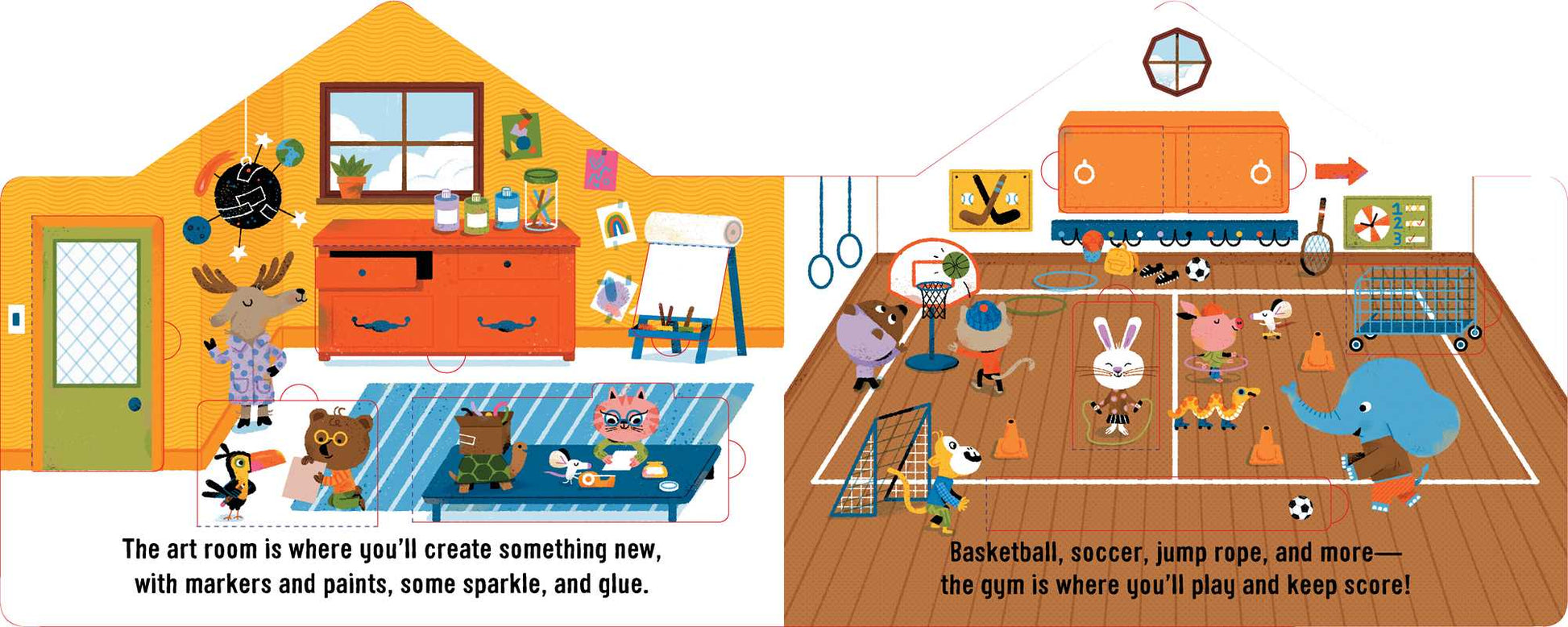 This shaped board introduces young readers to all the different classrooms and activities a child can look forward to at school. From a typical kindergarten classroom, to the art room, music room, gymnasium, and cafeteria, little ones can lift the sturdy flaps to reveal a bunch of fun school day surprises!
