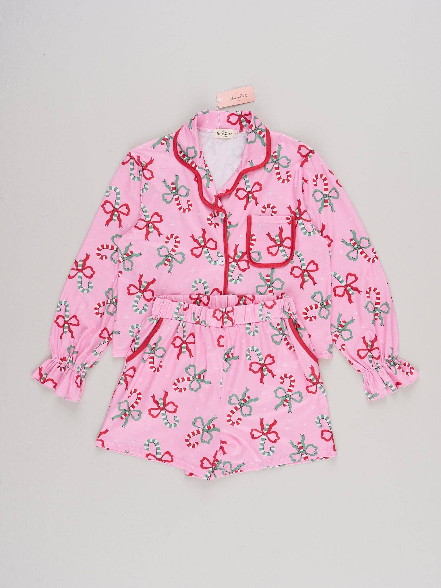 Sleep sweetly on Christmas Eve with the Mom & Me Pretty in Peppermint Pajamas! This comfy PJ set by Marie Nicole Clothing is covered in bow-tied candy canes for a festive, holiday look. With long sleeves and shorts made from soft, stretchy material, you can be festive while enjoying maximum comfort when you sleep and, of course, wait for Santa. As a Mom & Me set, you can even match with your daughter! * Mom & Me Design is a cropped fit. For a more relaxed cropped look, we recommend sizing up. * Top: 95% Polyester / 5% Spandex * Bottom: 95% Polyester / 5% Spandex
