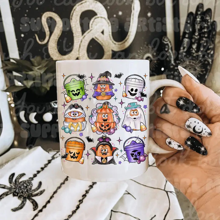 Enjoy the nostalgic designs of retro Halloween Happy Meal buckets with your morning potion of choice !