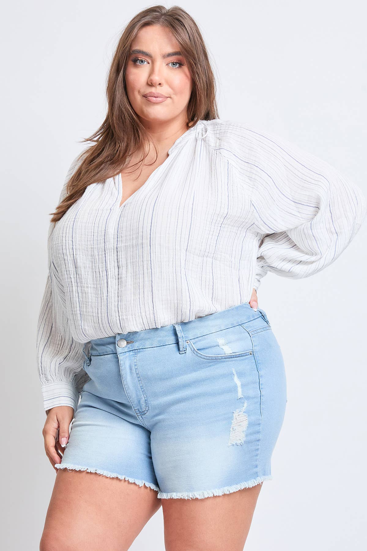 Our Missy Plus Curvy High-Rise Frayed Hem Shorts are designed with fading and whiskering. Also added light distressing & frayed hems. Made with a super stretchy & comfortable denim. Due to the nature of the novelty wash process & hand-crafted design, each garment will have a unique appearance.