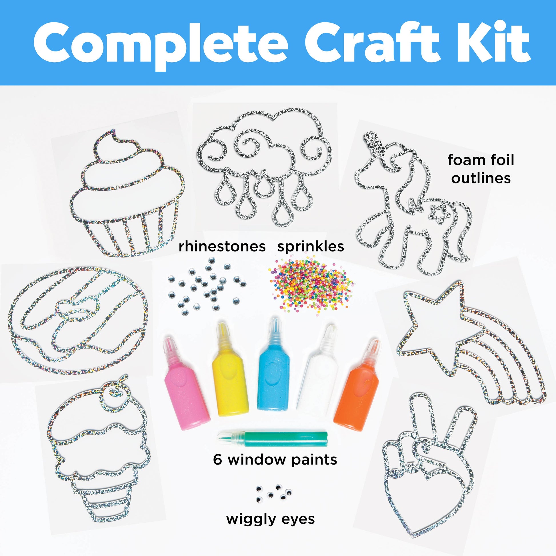 Make your own Window Art! Create 7 cute designs: Ice Cream Cone, Donut, Cupcake, rain cloud, unicorn, shooting star and peace sign Comes with everything you need to make 7 rainbow sprinkles themed window art designs! Includes 7 foam foil outlines, 6 colors of window paint, rhinestones and wiggly eyes Making window clings is simple! Just fill in the foam foil outlines with window paint, then add rhinestones and wiggly eyes. When dry, display your window art on any smooth glass surface. Just press it into place! You can display your window clings on any glass surface! The sweet and cute decorations will look great on your windows and mirrors This open-ended craft activity allows for imagination and creativity to take the lead! Since 1976, Creativity for Kids has created innovative craft activity kits designed to stimulate and encourage natural creativity.