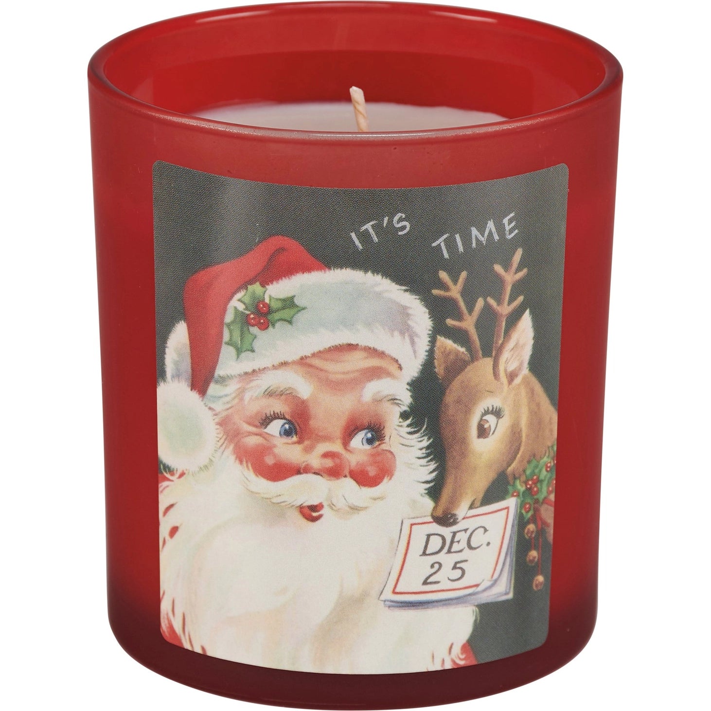 Assortment of four jar candles from our Christmas Collection displaying individual double-sided designs on a matte red jar. Each design features vintage holiday scenes of Santa and reindeer. Candles feature soy-based wax and a cotton wick with 35 hours of burn time activating a refreshing Evergreen scent. Our Santa's Reindeer jar candle set includes dust covers and plastic lids for protection and polished appearance. A jolly seasonal home accent set great for gifting.