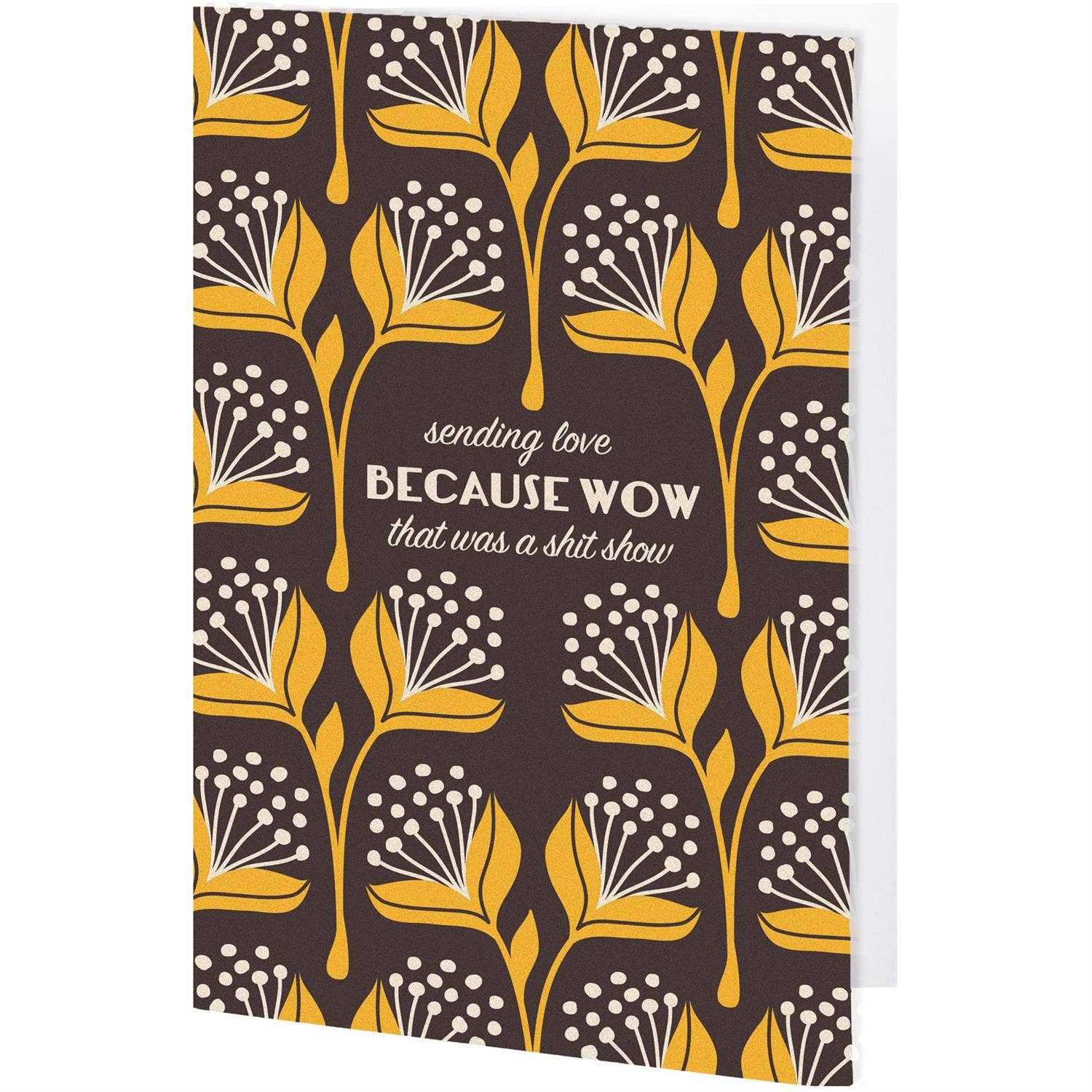 This sassy greeting card displays "Sending Love Because Wow That Was A Shit Show" with a coordinating stylish floral pattern in a bold color palette. There's no need to wait for a special occasion or a specific holiday, this everyday greeting card is perfect for any moment a customer wants to present a personal message using the blank space inside. Questionables greeting cards include a craft paper envelope for a high-quality finishing touch. Proudly made in the USA. Our Sending Love greeting card offers a more relatable way to reach out to like-minded friends and family while letting them know that everyday life can be hard, but they got this.