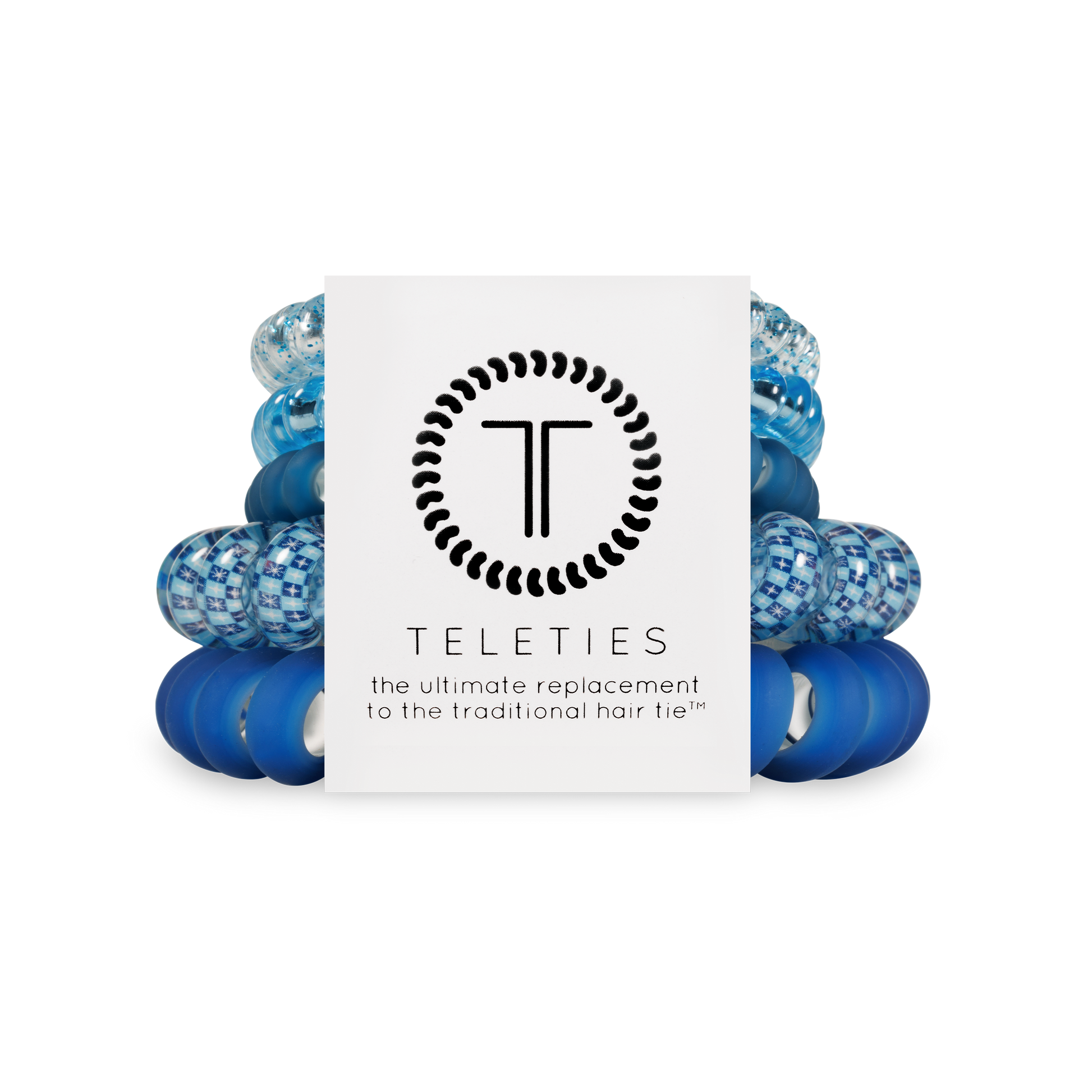 TELETIES are the hair ties with a strong grip that won’t break, and they double as a stylish bracelet. Durable, chic, and practical, TELETIES are the ultimate accessory to elevate your hair game while adding a trendy touch to your look this season. This five pack includes 3 smalls and 2 larges. The large size is 6.5cm wide x 1cm thick. The small size is 4.5cm wide x 0.5cm thick.