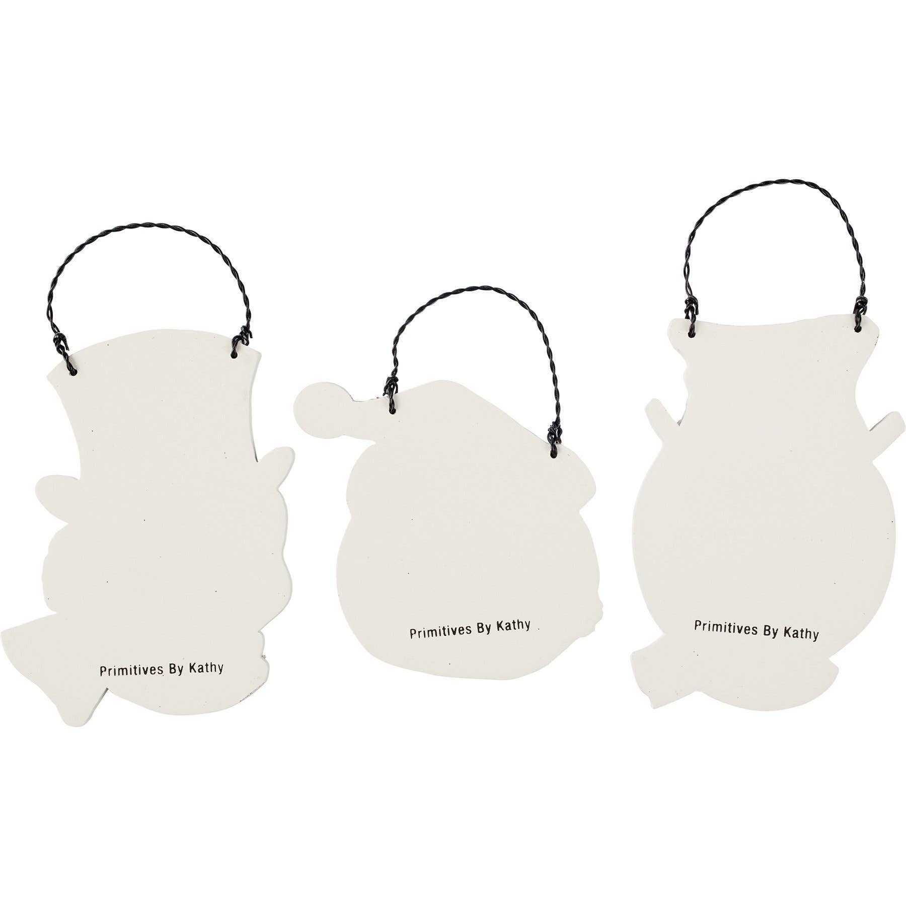 A set of three decorative ornaments from our Christmas Collection featuring wooden cutouts of snowman faces in a vintage art style with glitter accents. Each ornament includes individual designs and coordinating white color on the sides and backs. Easily display using attached twisted wire hangers. Our Snowmen ornament set comes packaged together in a poly bag tied with red ribbon. A charming set of seasonal home accents with a variety of display options.